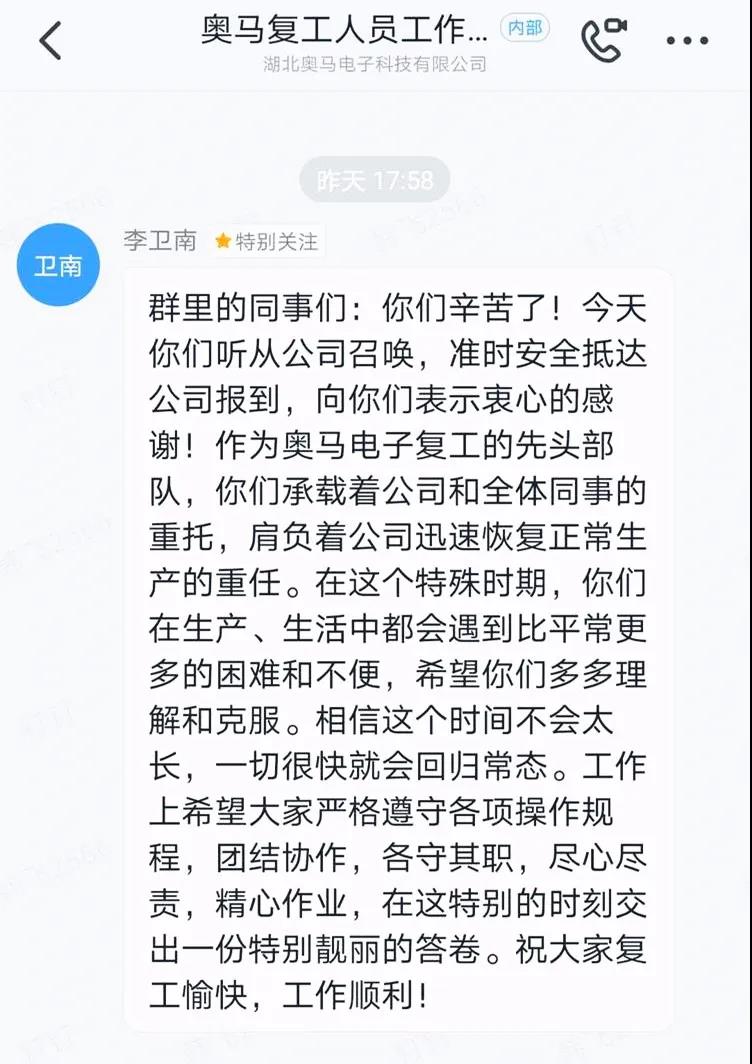 Staff Care, Warm and Touching "During the outbreak of epidemic, the company will not reduce its staff, nor will it have to worry about the payment of wages." Since January 27, OMAR electronic began to track the health information of employees, keep employees informed of the epidemic information and the company's dynamics, so as to reduce their anxiety and uneasiness and cooperate with the epidemic prevention work.